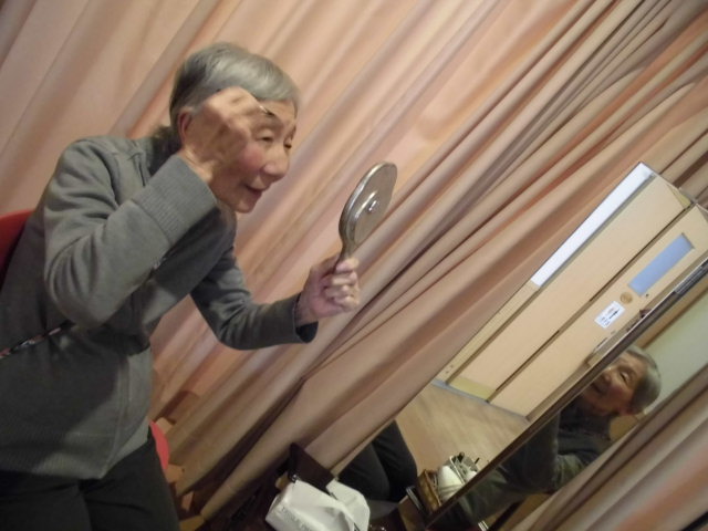 入浴後、鏡台の前に座り眉毛を書くYさんでした。