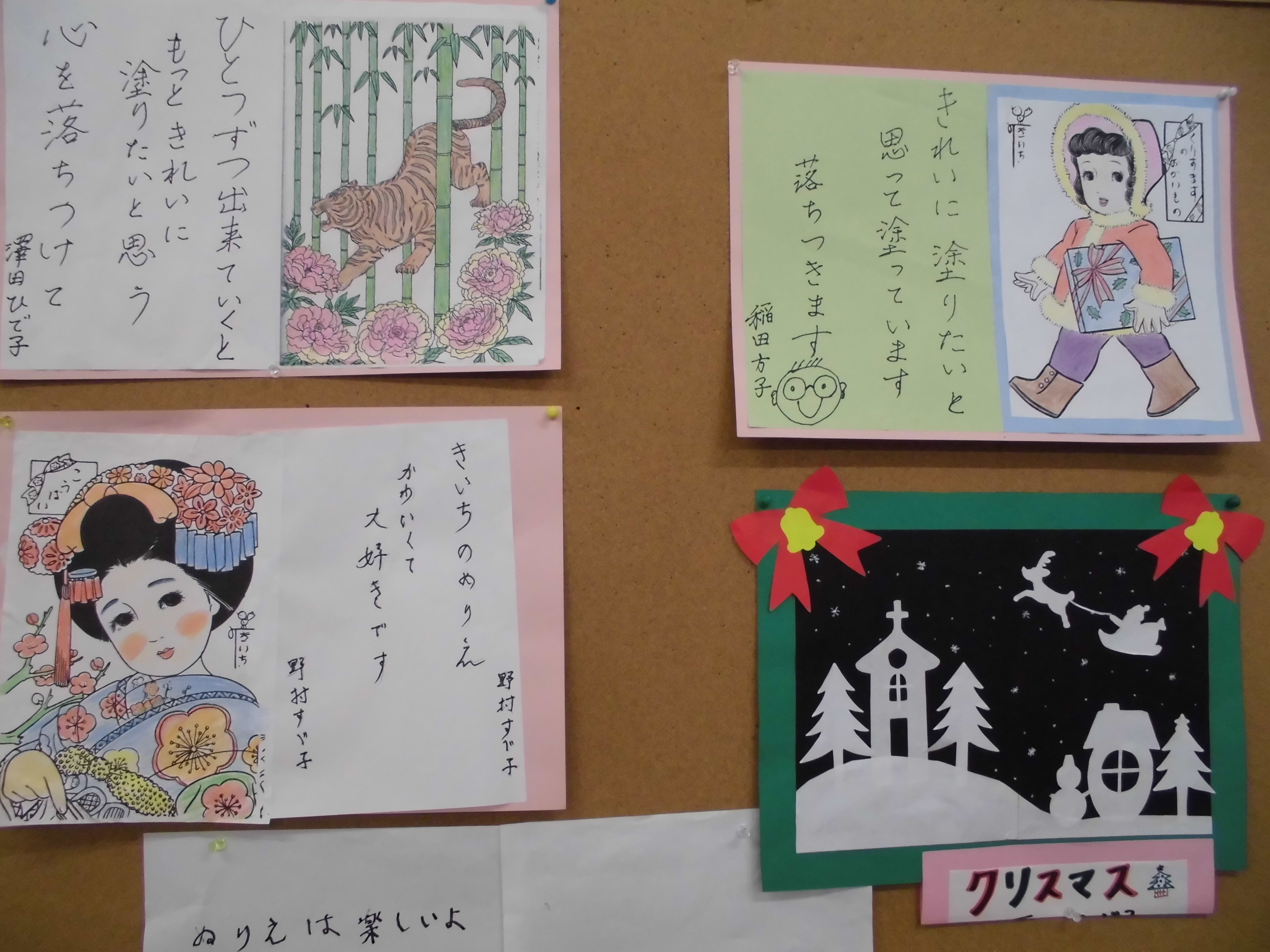 塗り絵展示コーナーや切り絵コーナーもあります。