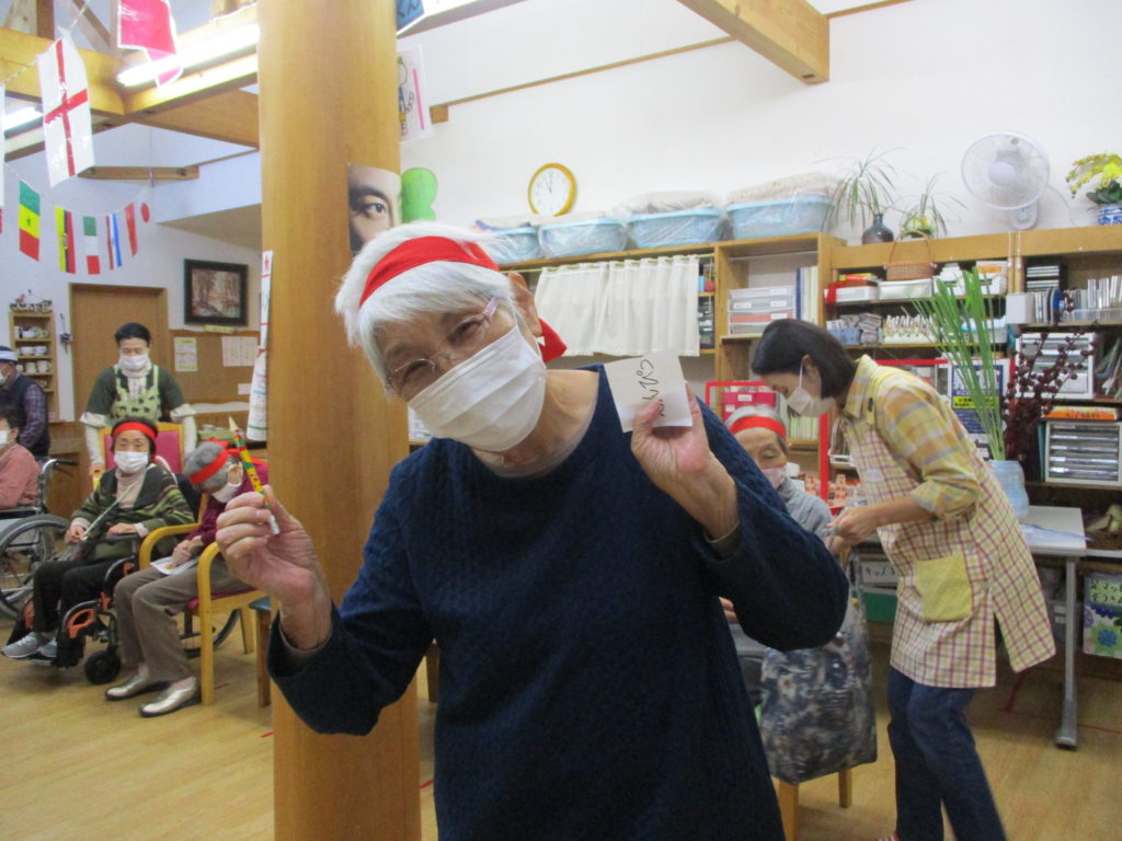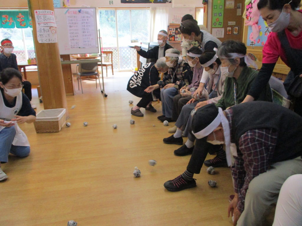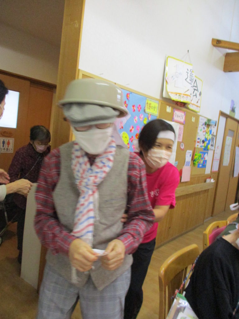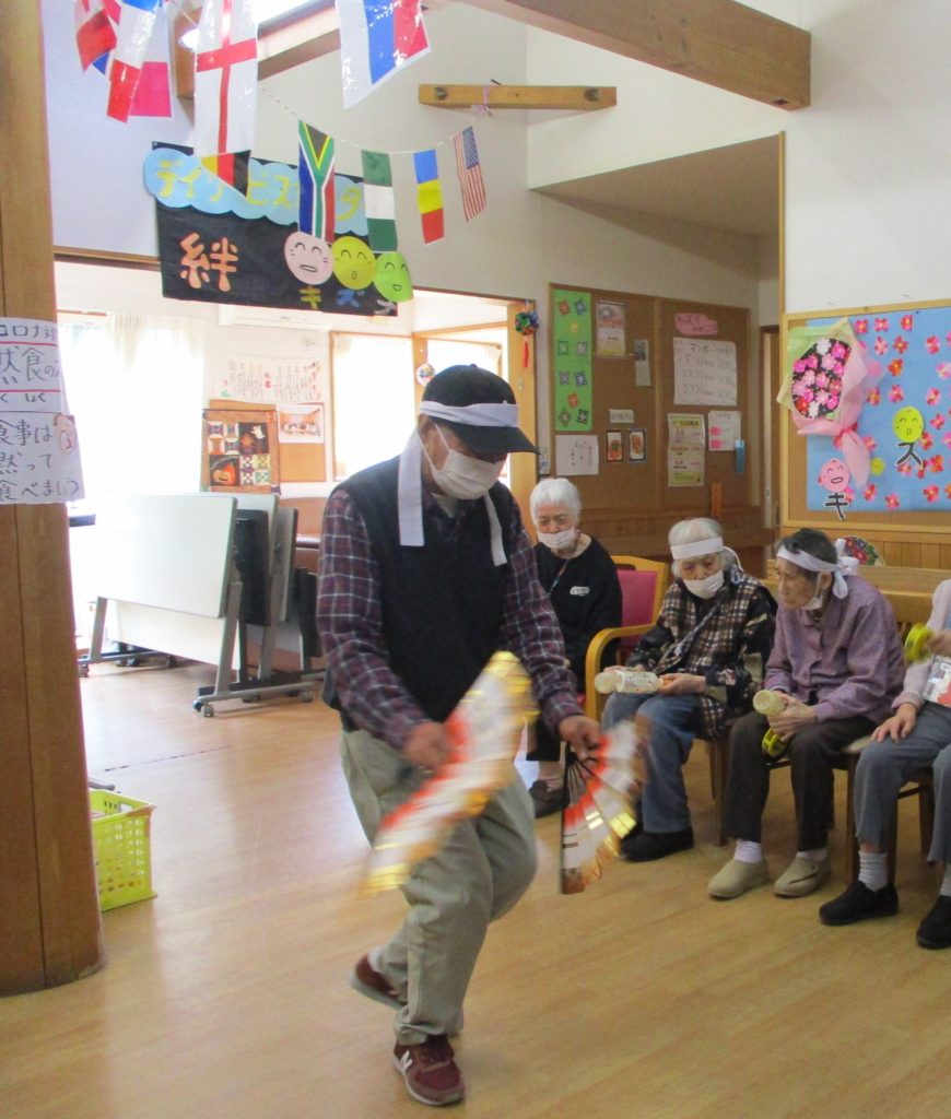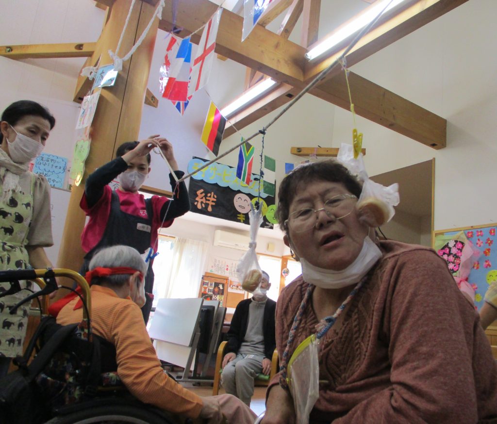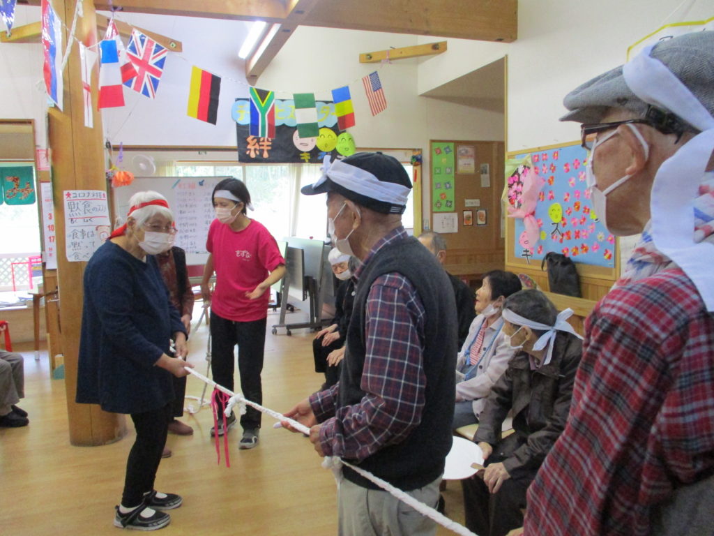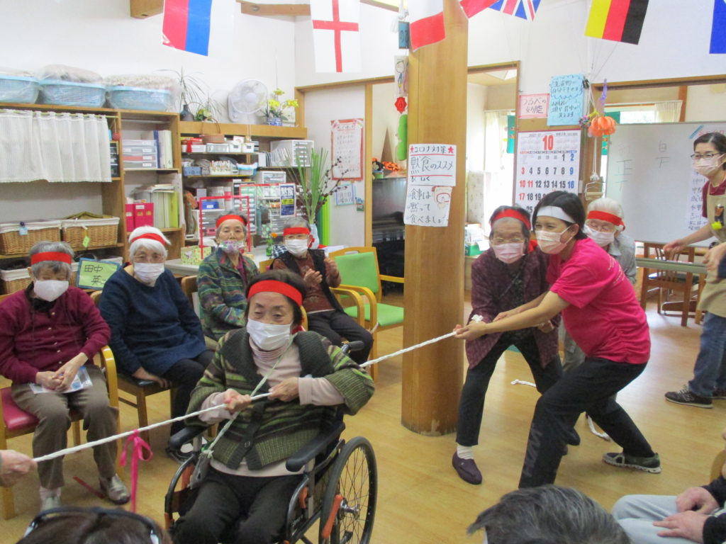 綱引き・・・「ん~!!」と全力で綱を引き、勝利に貢献されたHさん。相手方の利用者さんが、ずりずりと引きずられてしまうという頑張り💦に、拍手👏。