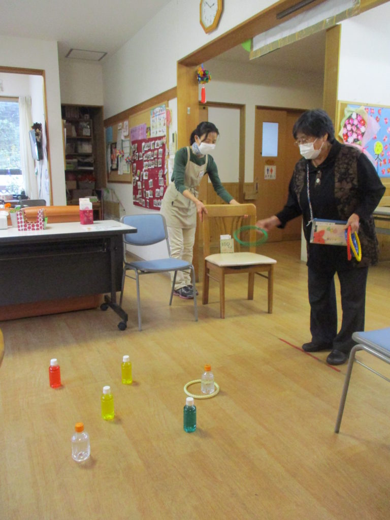 おやつ後の、一儲け?100キッズで輪投げに参加。1つ入れば、100キッズ獲得できます。