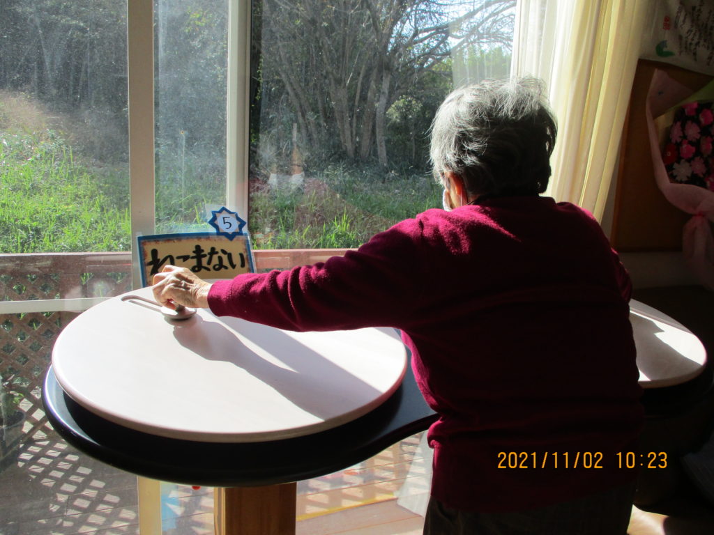 5分程クルクルと円盤を回すと、肩甲骨も動き、衣類の着脱が楽になります。