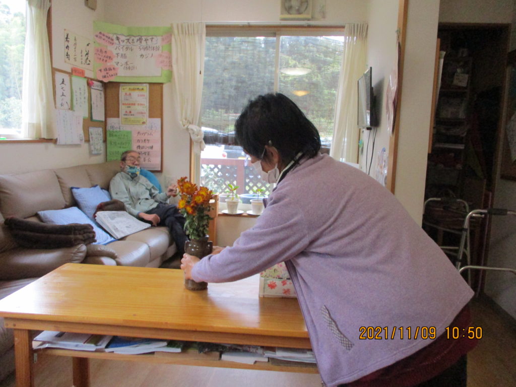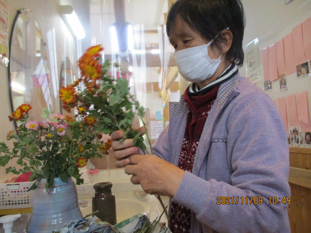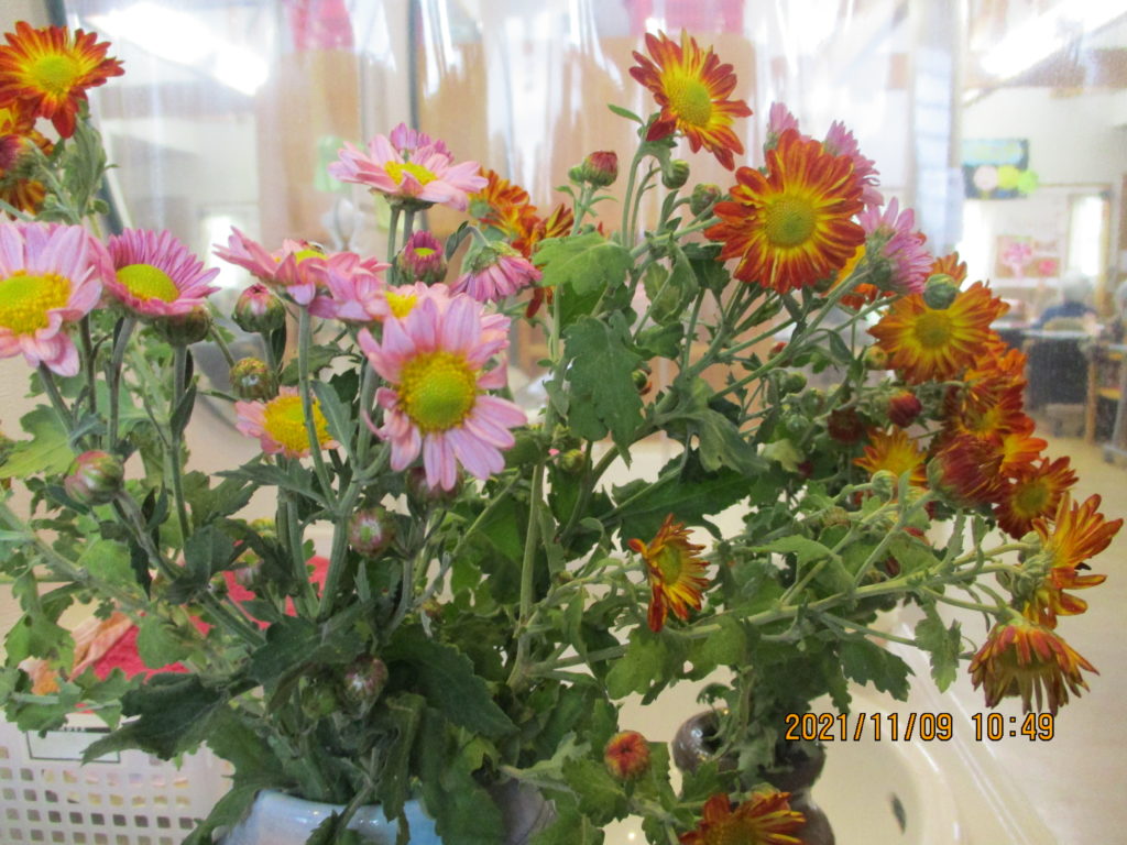庭で育てた菊を持ってきて下さり、ご自分で花器に挿してくださいました。