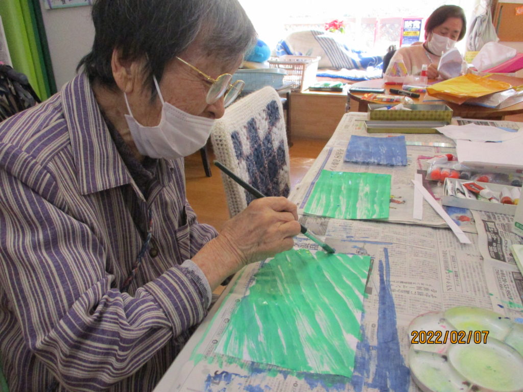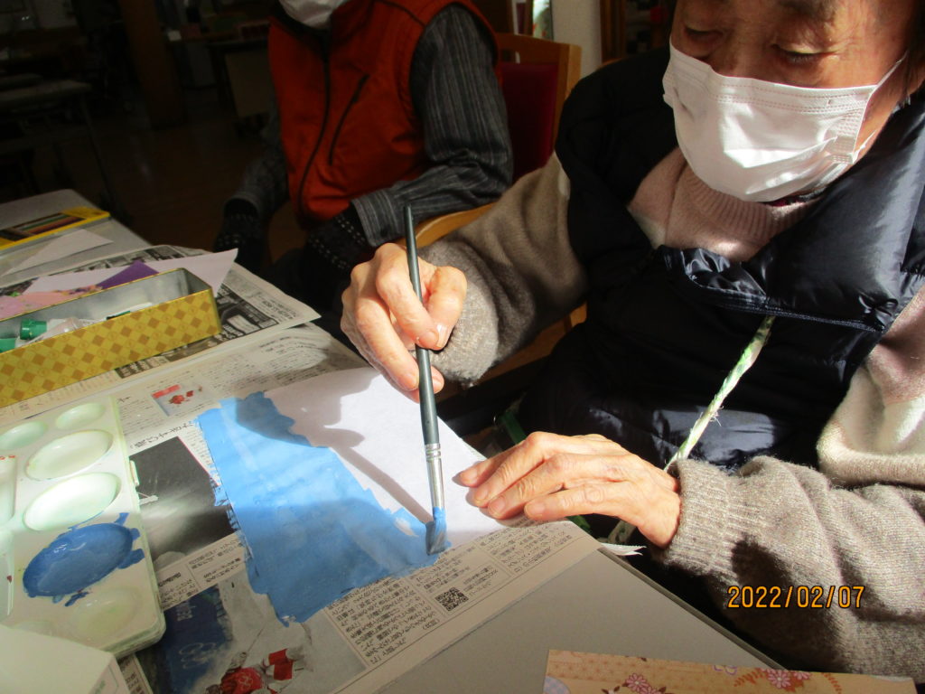 「水色がいいわ~」と半紙に色を塗るSさん。破れないように慎重です。