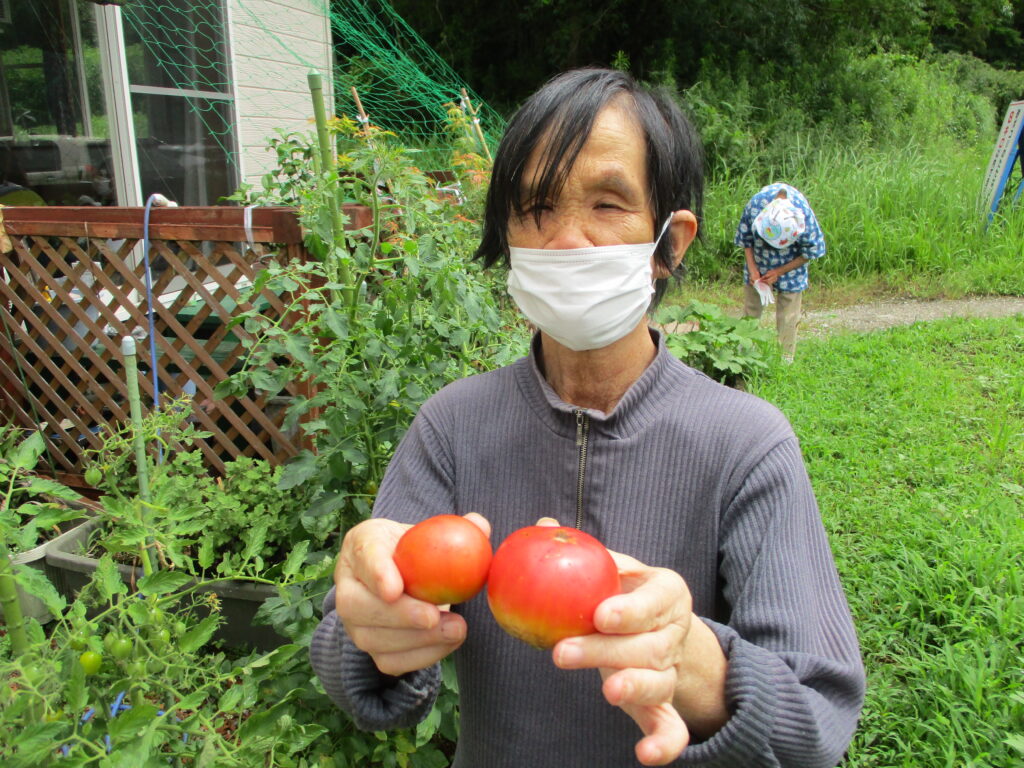 デイの畑では丹精込めて育てた野菜の収穫も楽しみ。お昼ごはんを彩ります。