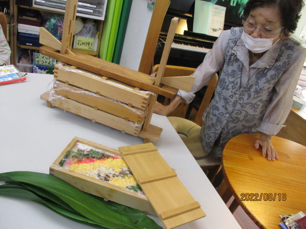 秋のお祭りにちなんで箱寿司をいただきました。懐かしい~と皆さん大喜び🎵