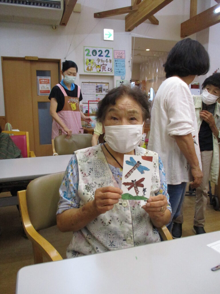 「新聞ちぎり絵」 赤とんぼが飛び交う季節ももうすぐですね☺