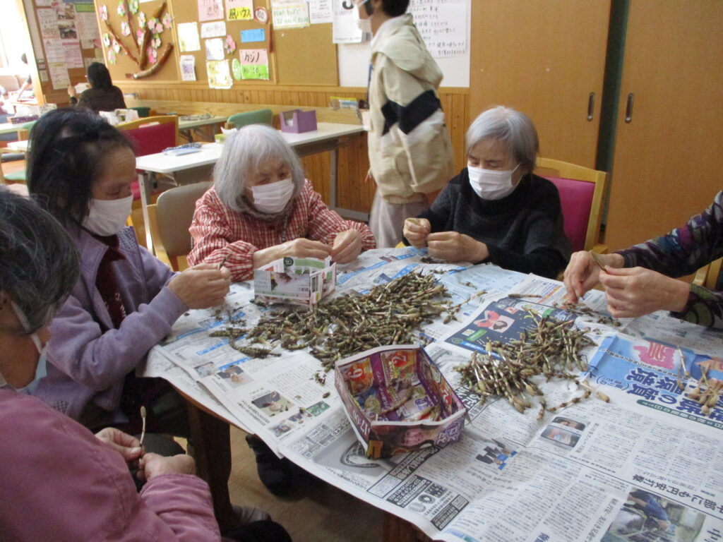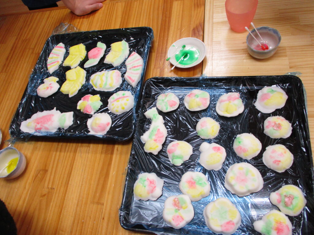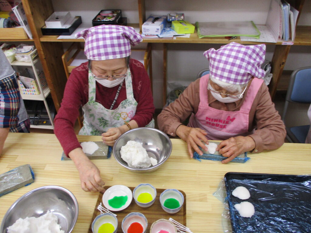 ひなまつりでは恒例のおこしものつくり。「90を超えて初めて作ったわ~」と夢中になるNさん。