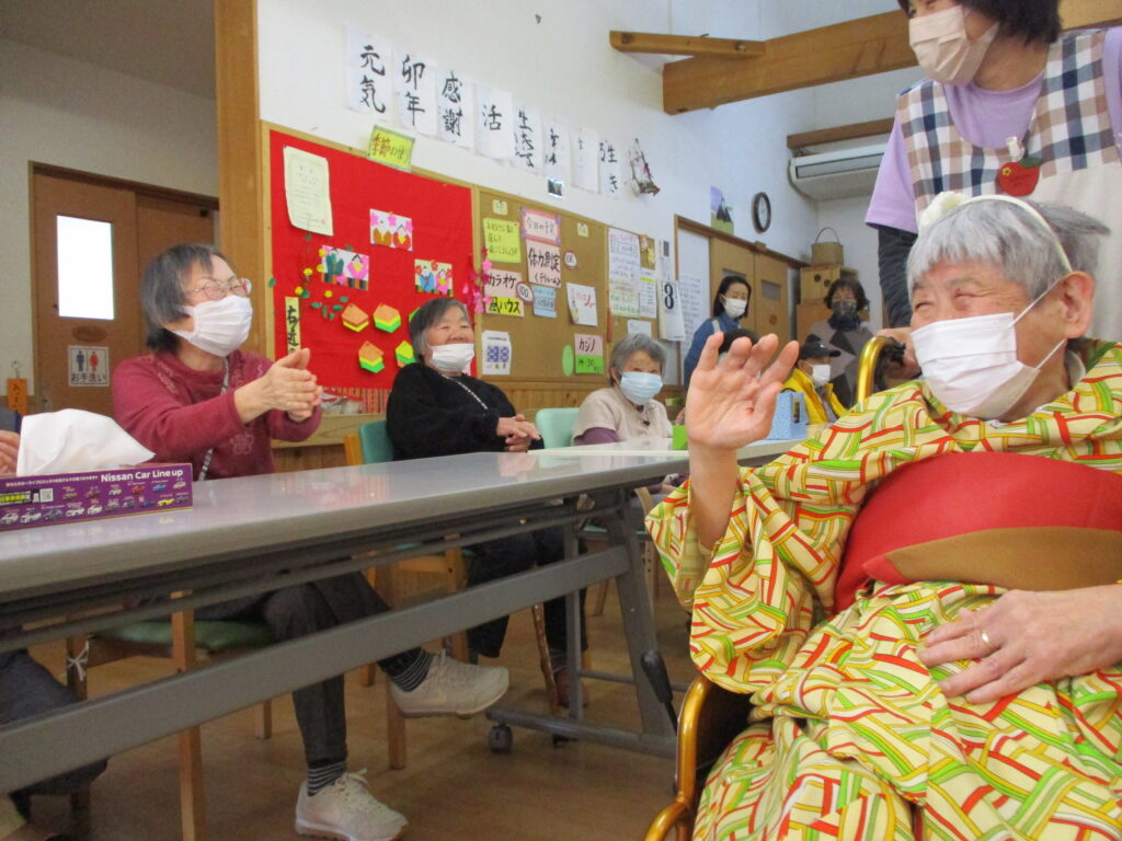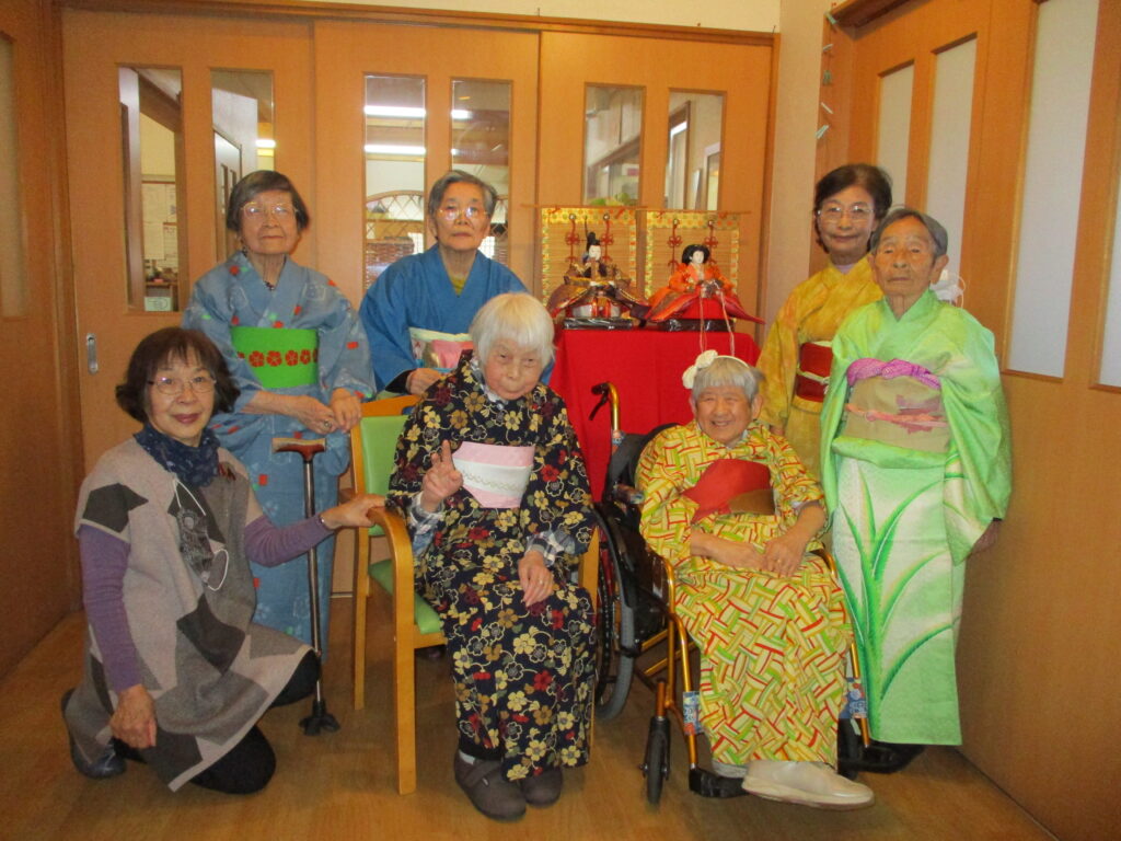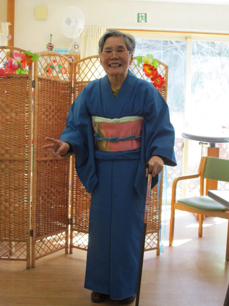 ひな祭りは着物ショーを開催しました。まずはご自分で着物と帯を選びます。「これ、前に着たやつだよねえ」「今度はこれにしよう」と活気あふれる舞台裏。立つだけでもえらいのに、いろんなものにつかまりながら、着付けをします。