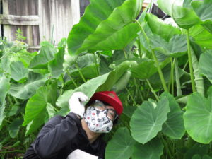 ちょっとブレイクしてのワンショット。 里芋の収穫はまだ先ですが葉はこんなに大きく育っています。