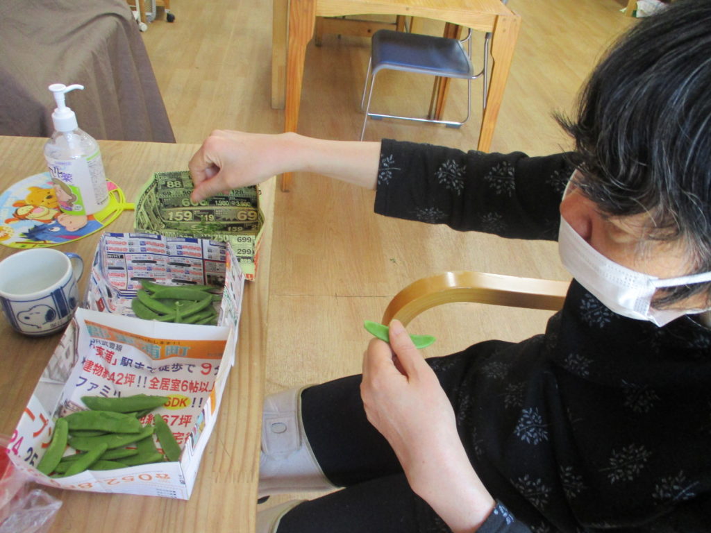 Sさんはスナップエンドウの筋取りをお手伝い♪♪