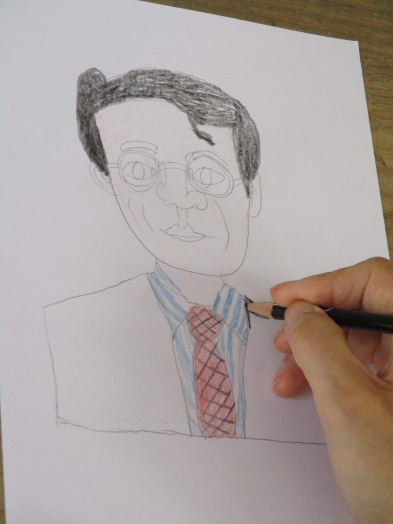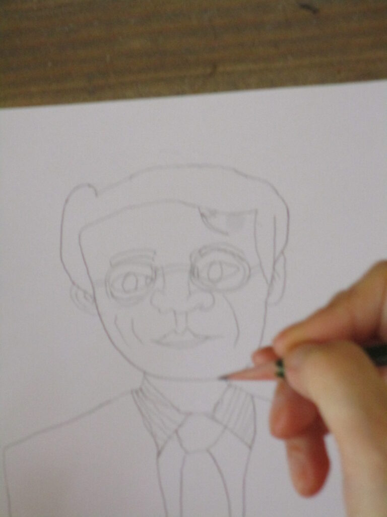 顔、頭を描き、目鼻口メガネと