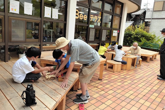 名城大学の学生さんがデザインし、地域の皆さんとワークショップで製作したハニカム工法で作ったテラス。
